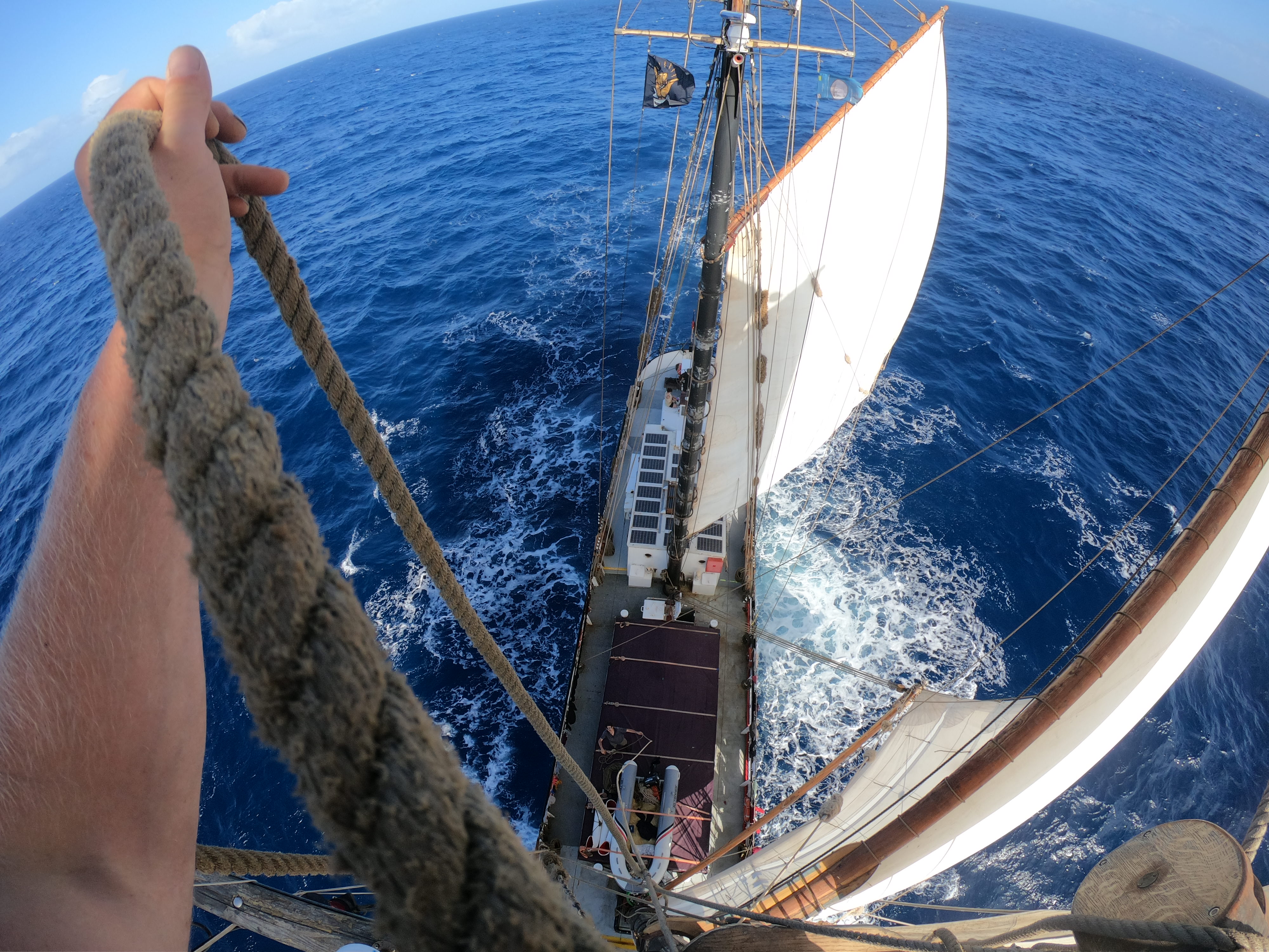 Während der Expedition erlebte sie den globalen Lock-Down, eine Crew, die nicht ausgewechselt bzw. von Bord gehen durfte. Traditionelle Arbeit, reine Muskelkraft, trotzend der stürmischen Winde, volle Konzentration bei jedem Handgriff auf einem Segelfrachter. Seenotrettung, Umweltzerstörung, Naturgewalten und die unendlich blaue Weite des Ozeans, waren Bestandteil ihrer Erlebnisse, sichtbar und fühlbar.